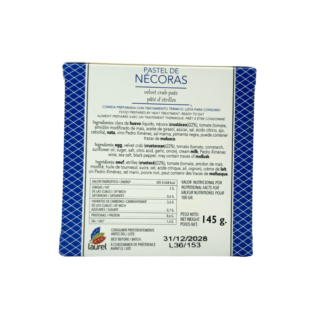 Ingredientes: Clara de huevo líquido, nécora (crustáceo) (22%), tomate, nata líquida, vino Pedro Ximénez, sal marina, pimienta negra.