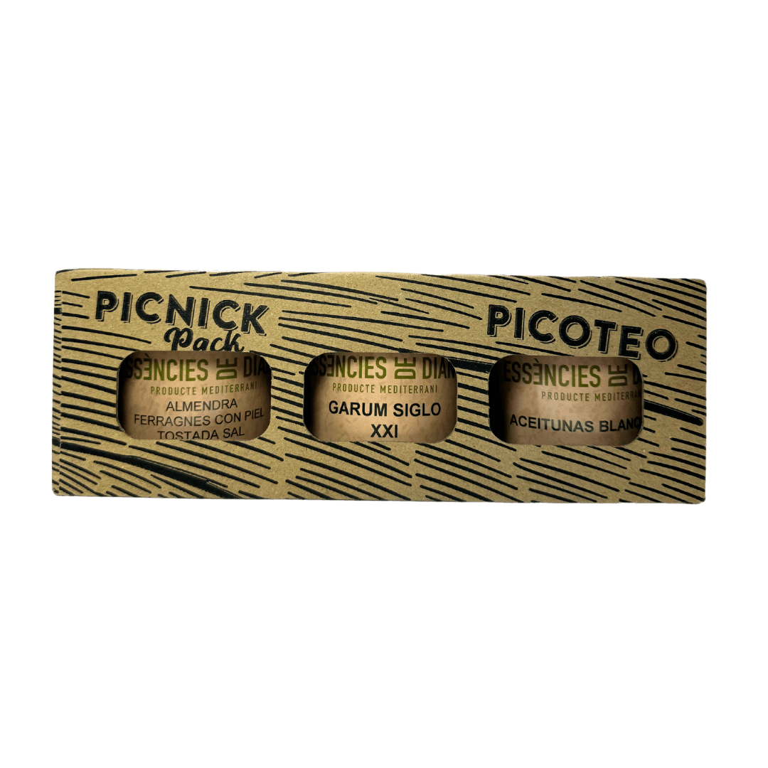 Descubre el auténtico sabor del Mediterráneo con el Picnick Pack Picoteo de Pico y Tallo, una selección única que combina productos artesanales y de alta calidad para disfrutar en cualquier momento. Este pack especial, de “Essències de Diánia”, incluye una deliciosa mezcla de almendras Ferragnes con piel tostada con sal, Garum S. XXI y las exquisitas aceitunas blanqueta, todo pensado para ofrecer una experiencia de picoteo auténtica y llena de sabor.